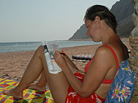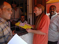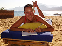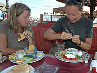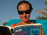 Today we have been on the beach for most of the day. Bert joined us. He came late and wanted to leave first as usual. In the evening we went asking around for scuba diving. We compared prices, courses and dive sites. There are a lot of dive centers in Dahab and we wanted to find someone serious. The choice fell on Deep Blue Divers, a five star PADI dive center. Bert and Catharina decided to take an Open Water Advanced course so that they can dive deeper and at more exciting places in the future. Anneli have already done that course but will hang along so that we can do the dives together.