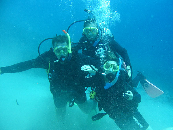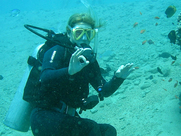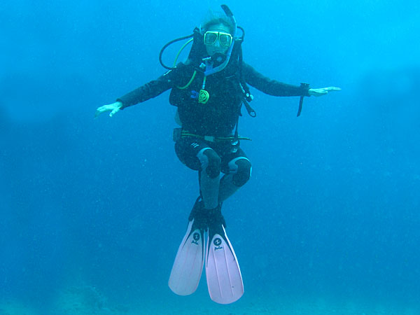 “Peak Performance Buoyancy” was the theme of the afternoon dive. The exercises were really fun to do. After safety; buoyancy is the most useful skill in diving. Catharina had some problems in the beginning, but at the end of the dive both of us ”hovered” peacefully without any problems. As a final test Laura put her diver’s knife in the sand and told us to “hover” over it and gently put our nose against the handle without touching the sand. That was no problem at all. It was great fun!