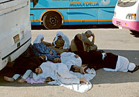 The cameleers are not nice to the camels at all. We could se that the camels hurt themselves, when they had to get up on the pick-up truck. One of the camels seemed to be a bit crazy and got loose from his cameleer. The camel went for Catharina and Anneli, who ran away in panic and hid behind a pick-up truck.