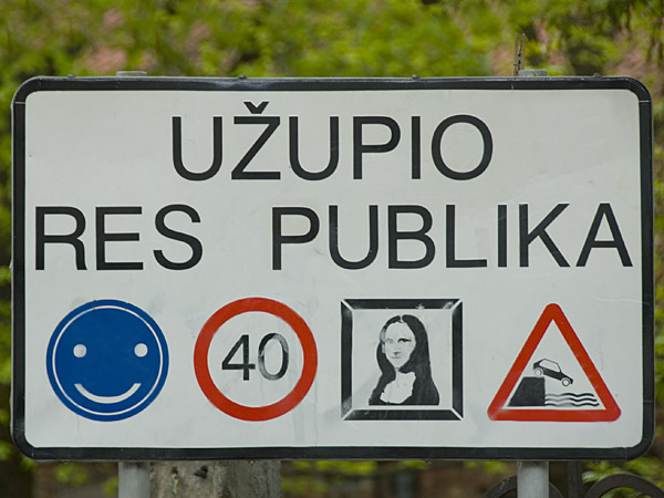 in a part of town called Uaupis, where the Vilnia river makes a bend. It is kind of arty, hippie place for alternative living. April 1st 2002 they announced the new republic, and the angel is their symbol. As a republic they of course have their own constitution too. Here are a few of the more memorable lines ”Every dog has a right to be a dog”, ”People have the right to sometimes not know if they have any duties” how about “People have the right to die, but it is not a duty”.