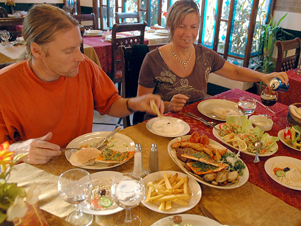 Uploading the site is rather difficult in Syria. Most of the internet cafes do not let you connect your own computer and finally we gave up and sent everything to Peo in Sundsvall so he can do it. It took a few hours to hassle with this so we had a quick meal at a “hole in the wall”.