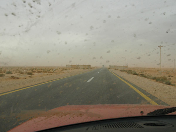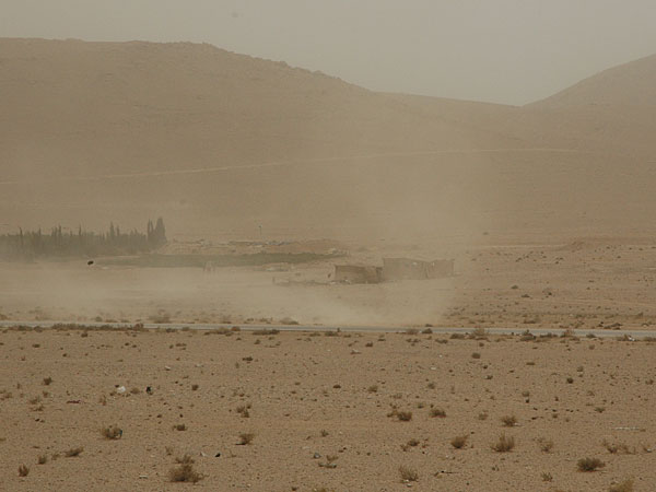 A short résumé of the day; been driving 300 kilometers through sandstorm and rain from Palmyra to Aleppo. Parts of the way were in both rain and sandstorm. How big are the odds for that?