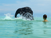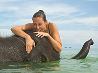 Today we have been swimming with a three year old elephant. That was really wonderful! We got to ride it and play with it. It was not all that easy to climb up. He was so cute tumbling and