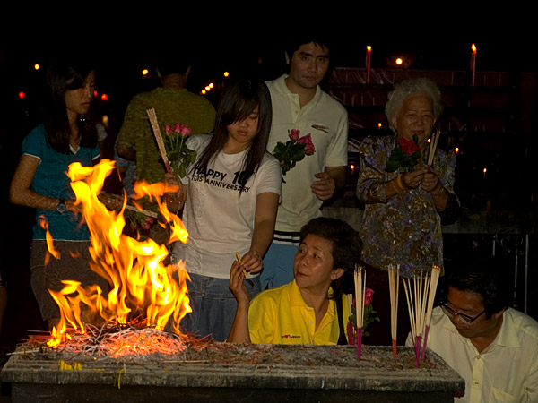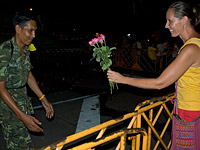 Men det här var inte det enda som pågick på den öppna platsen utanför kungens palats. Samtidigt pågick firandet av en av Thailands gamla kungars födelsedag. Detta firades med offergåvor, ljus, rökelser och blommor. En av grupperna som hade slagit på stort bjöd oss att sitta ner med dem för en pratstund. De knöt vita snören för lycka och välgång runt våra handleder.