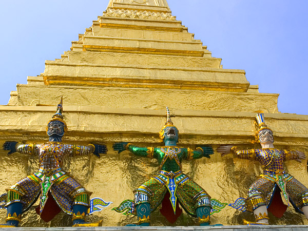 Here is also The Monastery of the Emerald Buddha; the private chapel of the royal family. That is why no monks live in monastery, but it is open for visitors and praying Buddhists. It is like an explosion of glitter, gold and mirror dressed statues. A lot of restoration is going on. With a